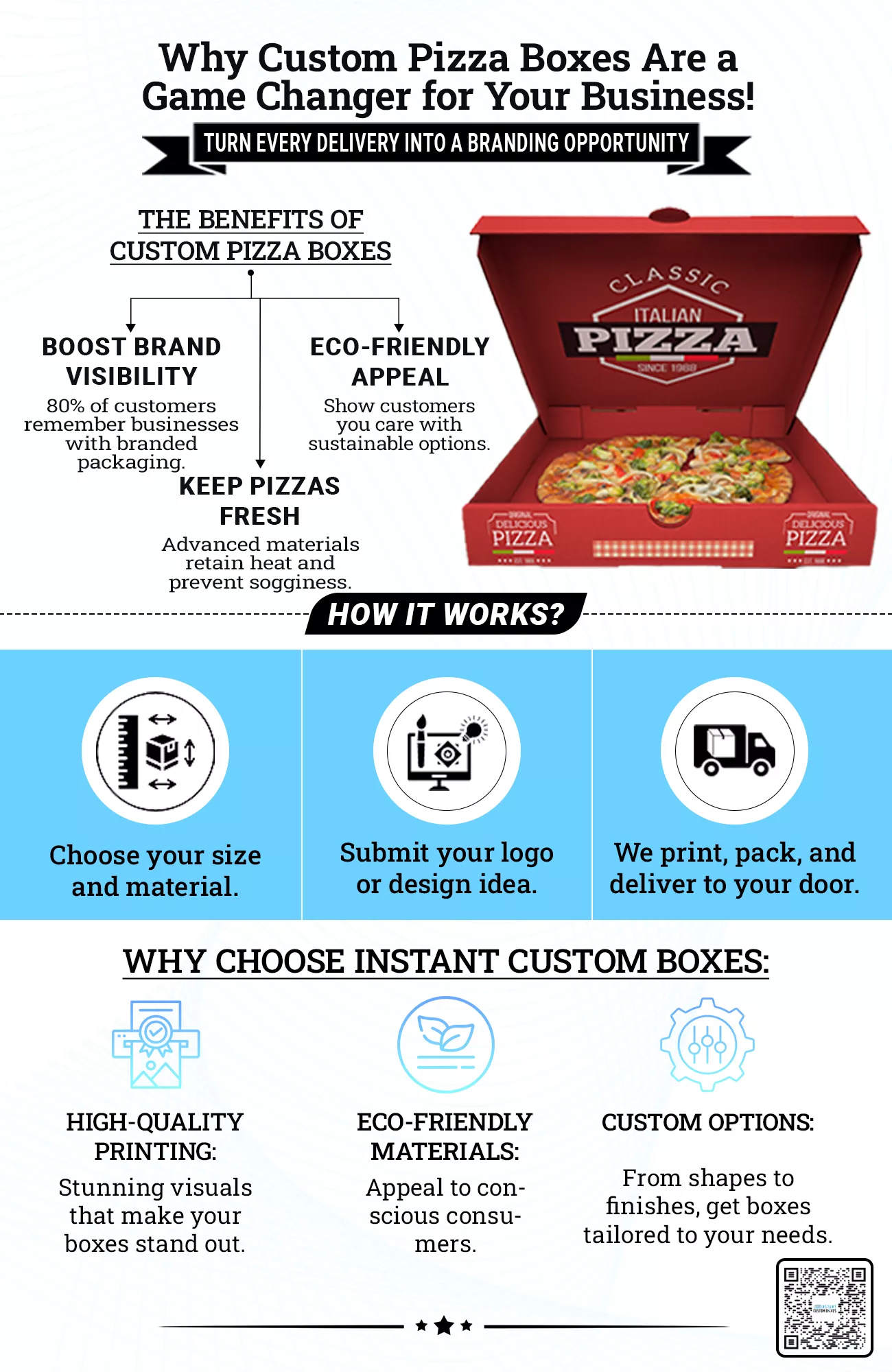 Well, to meet your needs, Instant Custom Boxes provides personalized pizza boxes wholesale in all sizes, shapes, and design requirements like logos, etc.